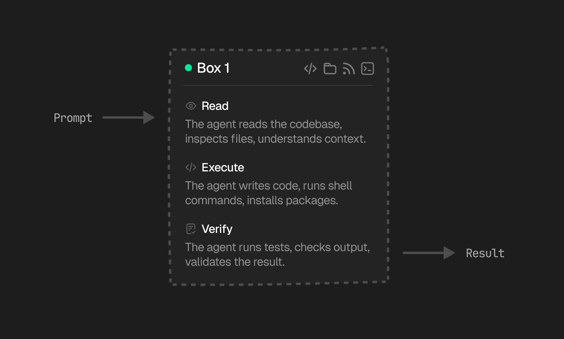 The box automatically enters Running state after creation. Your agent can run bash commands, read and write files, interact with git, and make outbound network requests.stdout and stderr stream back in real-time.