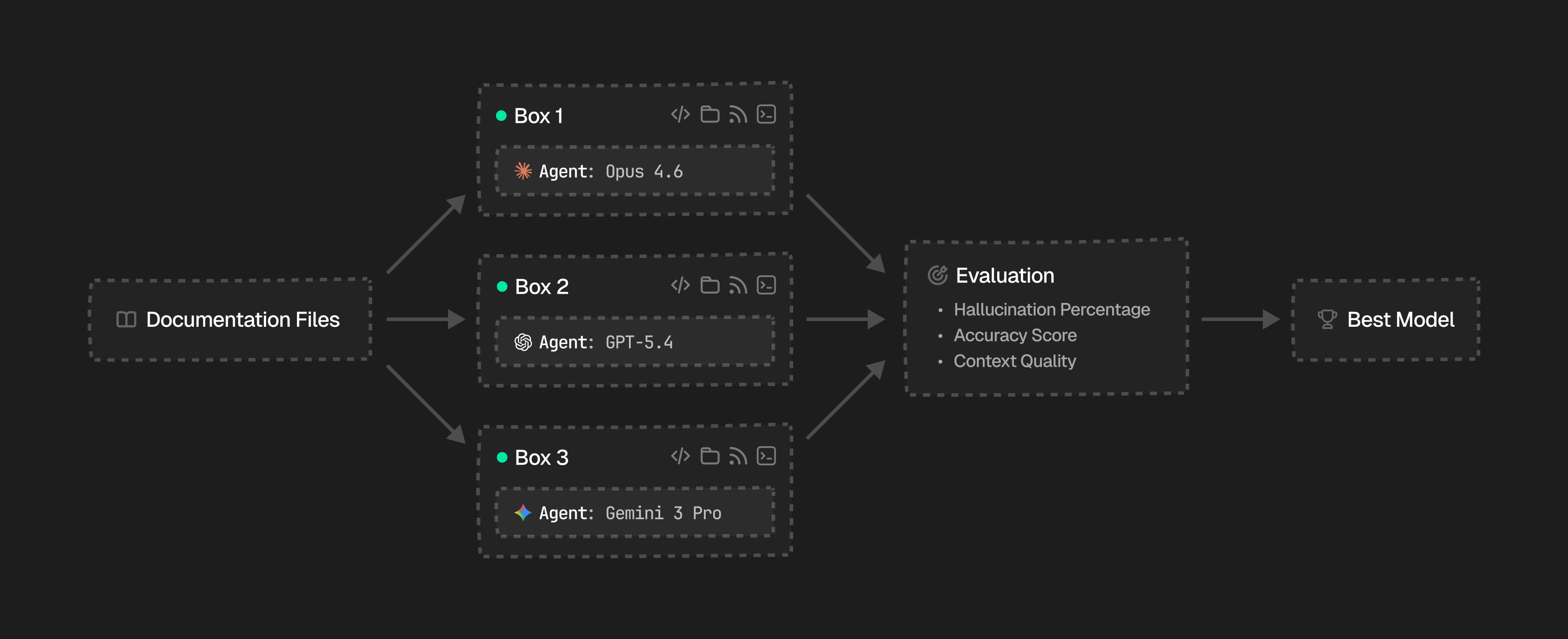 Box makes it easy to run parallel test scenarios at scale. Spin up N boxes, each running a different model against the same inputs, and compare the results side by side.