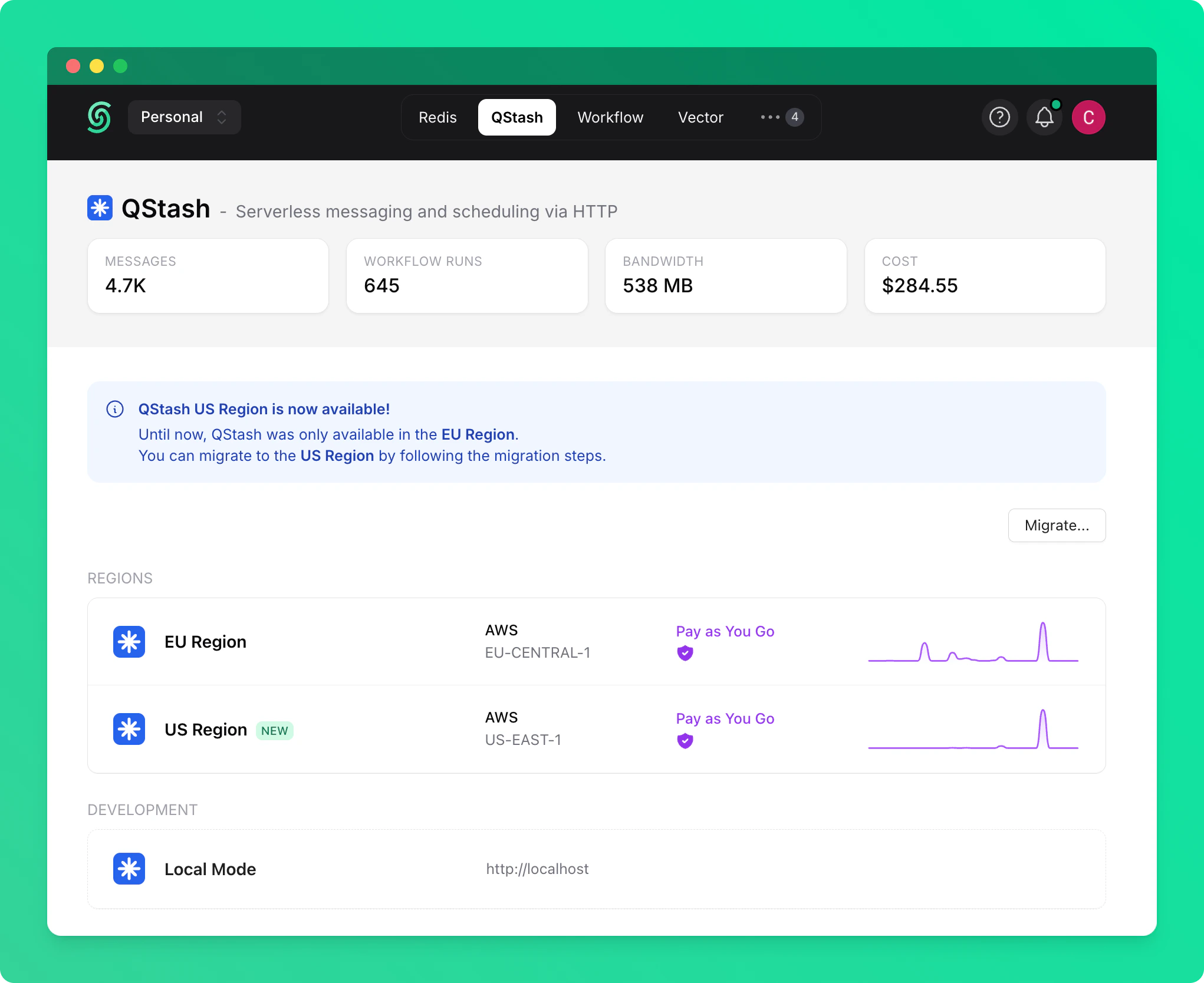 QStash is available in two regions: EU region and US region. Each region is completely independent with its own infrastructure, pricing, resources, logs, and messages.