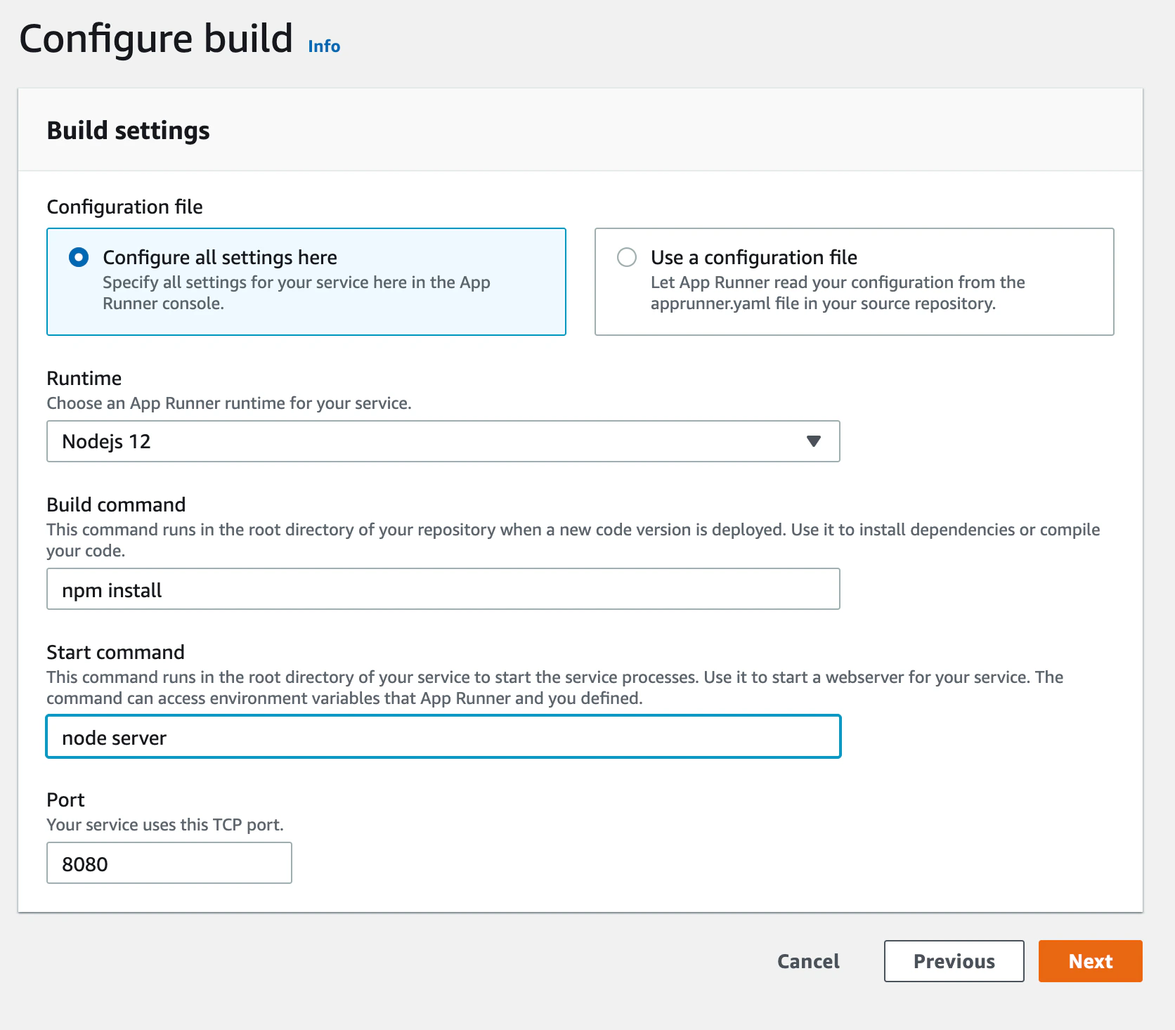 In the next page, choose Nodejs 12 as your runtime, npm install as your build command, node server as your start command and 8080 as your port.