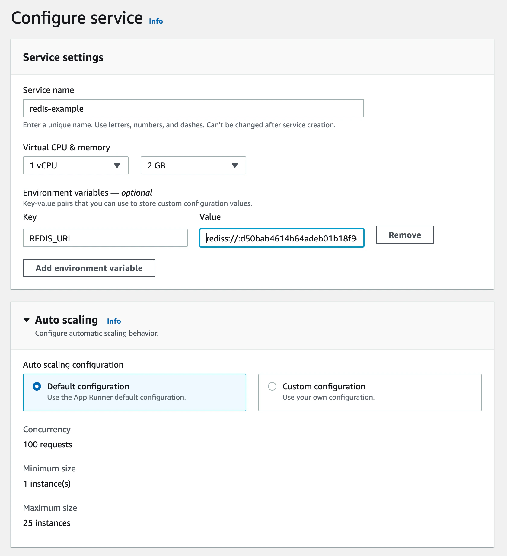 The next page configures your App Runner service. Set a name for your service. Set your Redis URL that you copied from Upstash console as REDIS_URL environment variable. Your Redis URL should be something like this: rediss://:d34baef614b6fsdeb01b25@us1-lasting-panther-33618.upstash.io:33618 You can leave other settings as default.