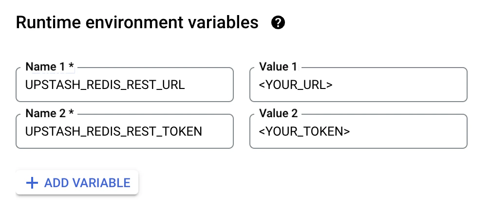 UPSTASH_REDIS_REST_URLandUPSTASH_REDIS_REST_TOKEN, setup Runtime environment variables under Runtime, build, connections and privacy settings like below.