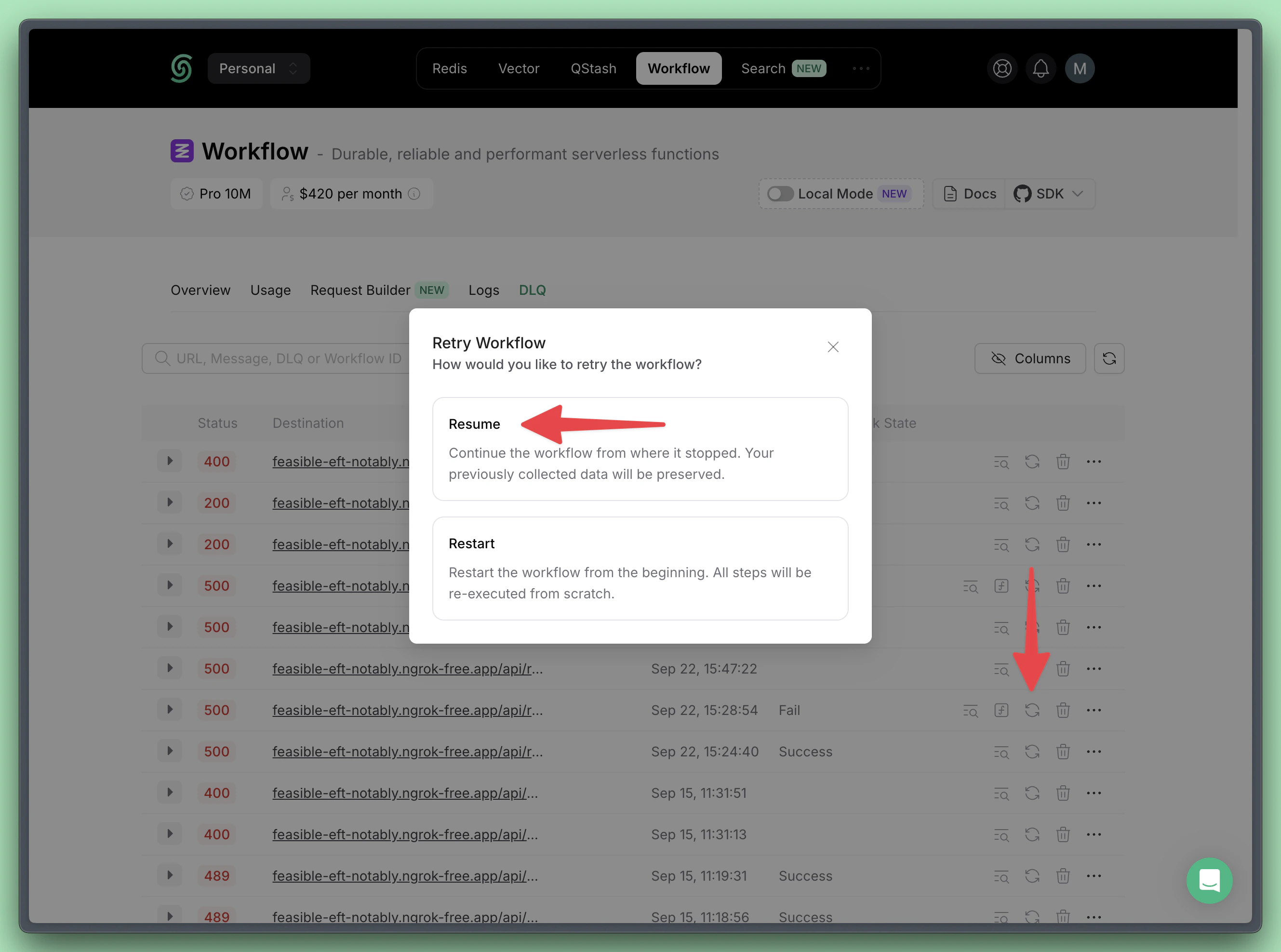 Changes to steps prior to the failure are not allowed and may break the workflow.For more details, check out the Handle workflow route code changes page.